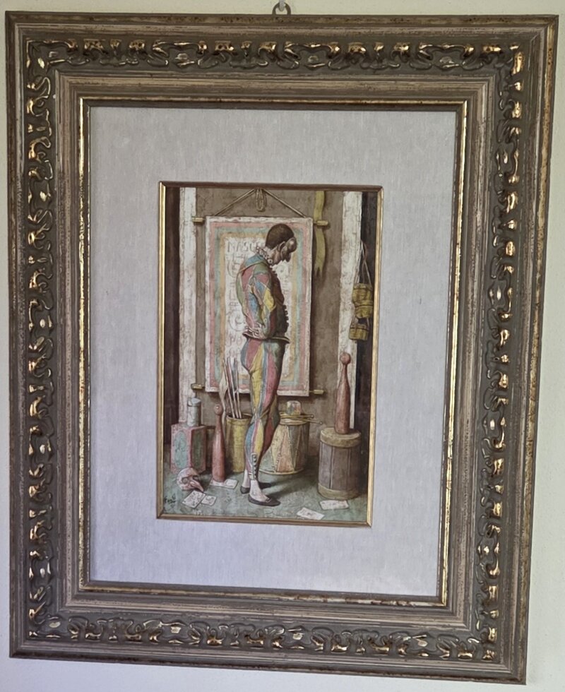 Questo olio è un’opera rara nella produzione dell’artista: un omaggio colto alla tradizione della Commedia dell’Arte, capace di commuovere e di far sorridere al tempo stesso. Un quadro che non decora soltanto una parete: la anima, la rende teatro dell’anima, invitando lo spettatore a riflettere sulla propria “maschera” quotidiana. Un tesoro per collezionisti che amano l’arte italiana del Novecento capace di raccontare storie profonde con leggerezza apparente