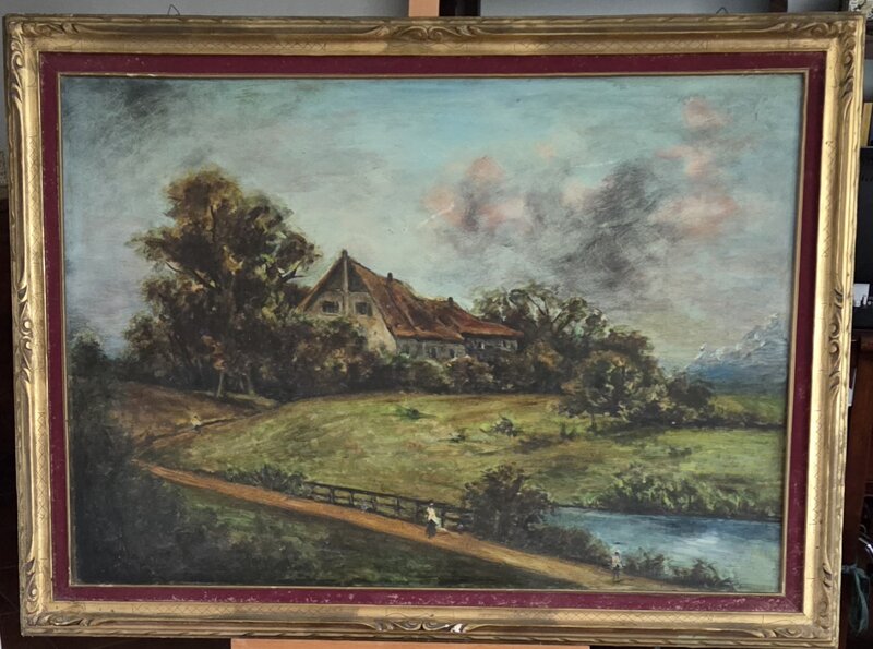 In questa veduta l’artista coglie un momento di quiete: un sentiero dorato costeggia un corso d’acqua placido, due piccole figure passeggiano, mentre una casa dal tetto rossiccio emerge tra le fronde. Il cielo, percorso da nuvole rosate e grigie, si apre su lontane montagne azzurrine, dando profondità alla composizione. La luce radente, calda e diffusa, accarezza il prato e definisce i volumi con una tavolozza terrosa, tipica del paesaggismo tardo-romantico. L’inquadratura, incorniciata da una cornice dorata con profilo bordeaux, esalta il carattere intimo e domestico della scena: non la celebrazione del sublime, ma la poesia del quotidiano, l’armonia tra uomo, casa e natura. È un dipinto decorativo e atmosferico, capace di portare in ambiente un senso di calma e memoria, perfetto per collezioni di arte dell’800/primo ’900 o per un interior dal gusto classico.