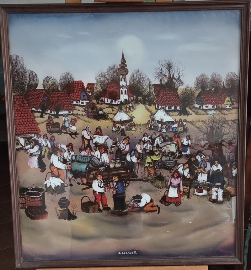 Datata “79” e firmata “A. Bardu”, l’opera appartiene a quella tradizione popolare dell’Europa centro-orientale che, dalla scuola di Hlebine in poi, ha fatto della narrazione semplice e gioiosa della quotidianità la propria forza. Un quadro decorativo, narrativo e caloroso, perfetto per portare in casa un senso di comunità e di festa paesana.