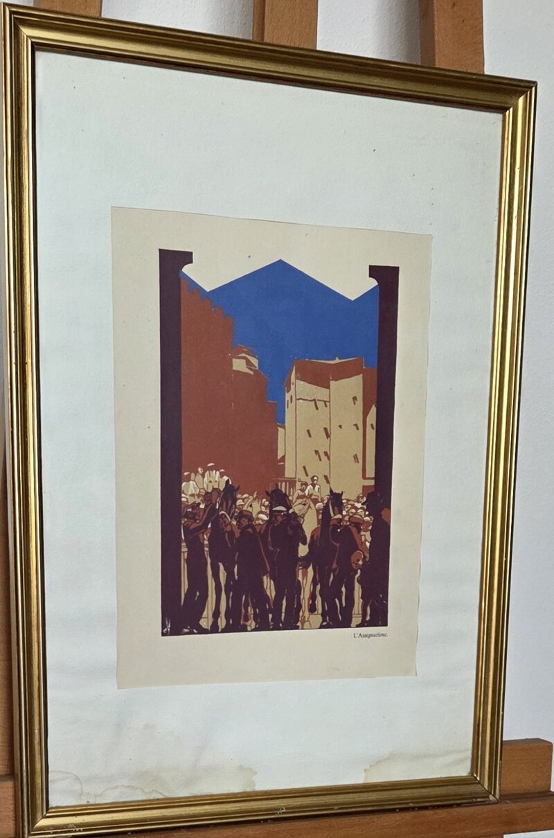 Cavalli nervosi, figure umane delineate con forza geometrica, un cielo azzurro intenso che taglia l’orizzonte come una lama di luce. L’artista anonimo degli anni Venti-Trenta ha saputo trasformare una scena quotidiana – l’assegnazione dei cavalli al mercato o alla caserma – in un’immagine di potente modernità. Con il linguaggio essenziale della xilografia a colori, riduce le forme a grandi blocchi cromatici, elimina il superfluo e crea un ritmo quasi musicale di masse e vuoti. È l’Italia tra le due guerre che parla: terra, lavoro, forza fisica, ordine geometrico. Non un’illustrazione qualsiasi, ma una dichiarazione stilistica che guarda al Futurismo depurato e al ritorno all’ordine del Novecento Italiano. Un’opera che respira concretezza popolare e al tempo stesso eleganza grafica, perfetta per chi ama l’arte che racconta il Novecento senza retorica, ma con la nuda potenza del segno e del colore.